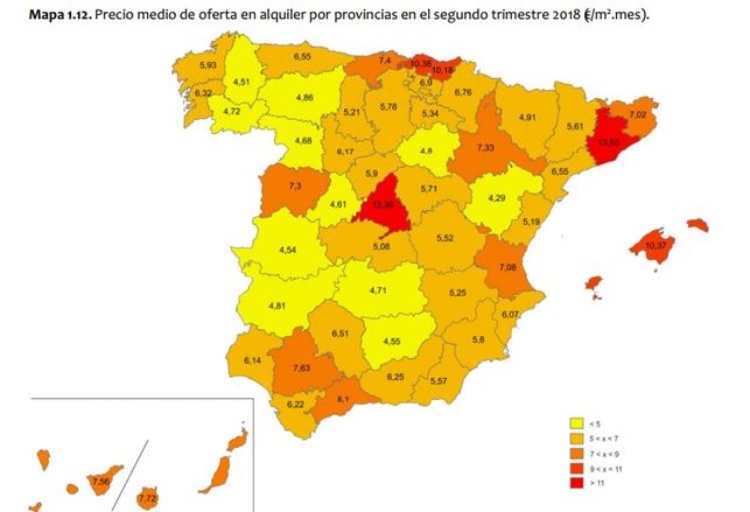 Otras variables que se ofrecen en el informe son las referidas a la renta media, la superficie media y la cuantía media del arrendamiento, según la información disponible de los registros de depósitos de fianza de las comunidades autónomas, así como el precio medio de oferta en alquiler según la información de los portales inmobiliarios Fotocasa e Idealista con desagregación por comunidades autónomas y provincias. Puede observarse así que las regiones con rentas de alquiler más elevadas son Cataluña, Madrid, País Vasco y Baleares. Por el contrario, las comunidades autónomas con menores rentas de alquiler son Extremadura y Castilla-La Mancha, en ambos casos, con datos de oferta iguales o inferiores a los 5 euros por metro cuadrado al mes.