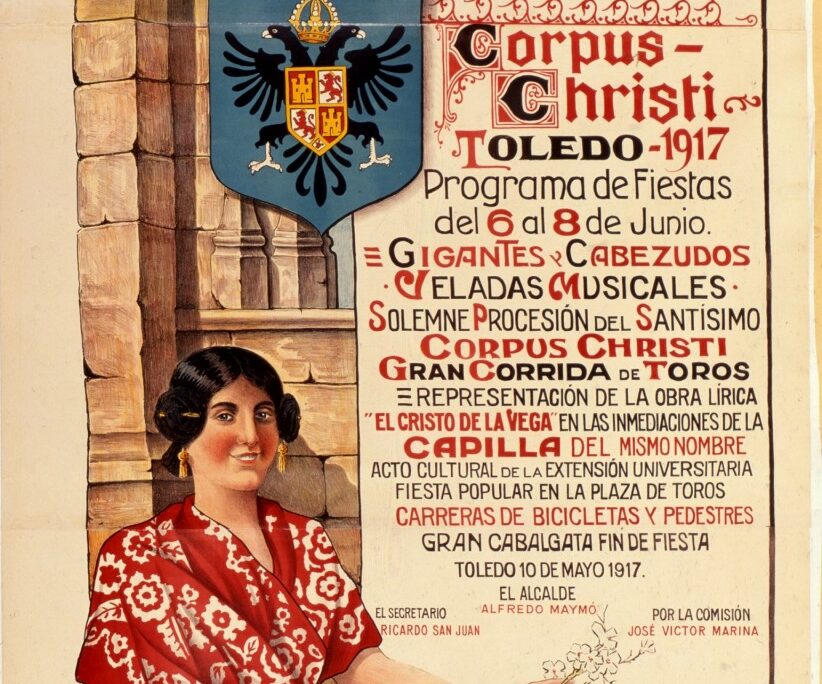 Se trata de numerosos cambios que pueden observarse echando la vista atrás a través de documentos institucionales y religiosos, fotografías o carteles, como los recopilados y publicados por el Archivo Municipal que acaba de compartirlos a través de la exposición virtual 'La Fiesta del Corpus Christi de Toledo. Carteles y programas'.