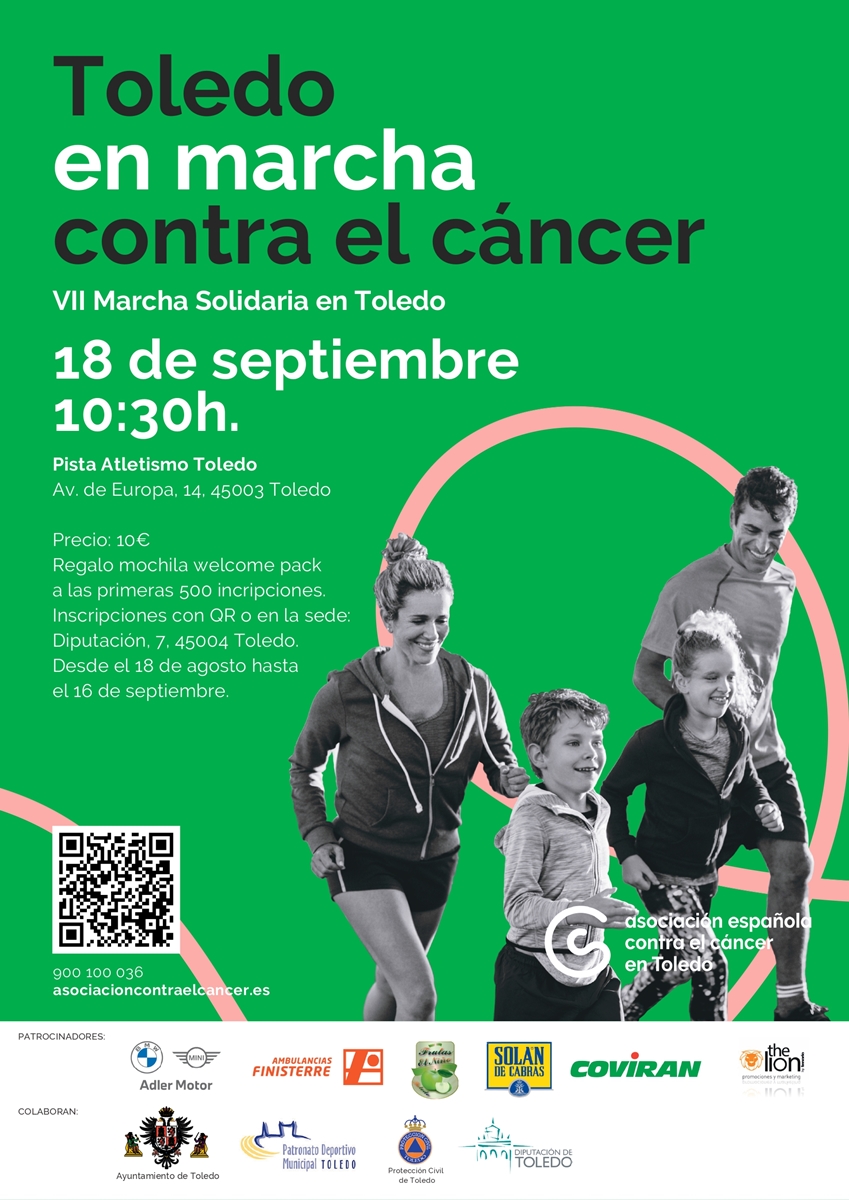 La VII Marcha Contra el Cáncer contará con el patrocinio de Adler Motor, Ambulancias Finisterre, Frutas el niño, Solán de Cabras, Supermercados Coviran y The Lyon By Tenorio y con la colaboración del Ayuntamiento de Toledo, el Patronato Deportivo Municipal de Toledo, Protección Civil y la Diputación de Toledo.