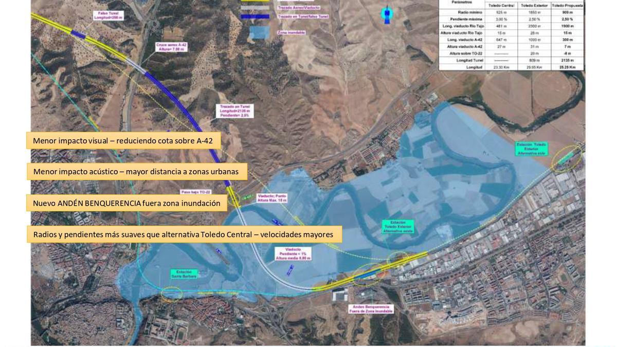 Desde el Ayuntamiento toledano han destacado que esta propuesta quiere mantener el reconocimiento de Declaración de Patrimonio de la Humanidad de la ciudad, por lo que tanto la ubicación como la construcción de los viaductos no afecte al impacto visual ni acústico de barrios como Buenavista o San Antón. Para ello se va a construir "un túnel de algo más de dos kilómetros para salvar toda la orografía y evitar cualquier tipo de impacto, sin condicionar el futuro desarrollo de la ciudad", destacó el alcalde.