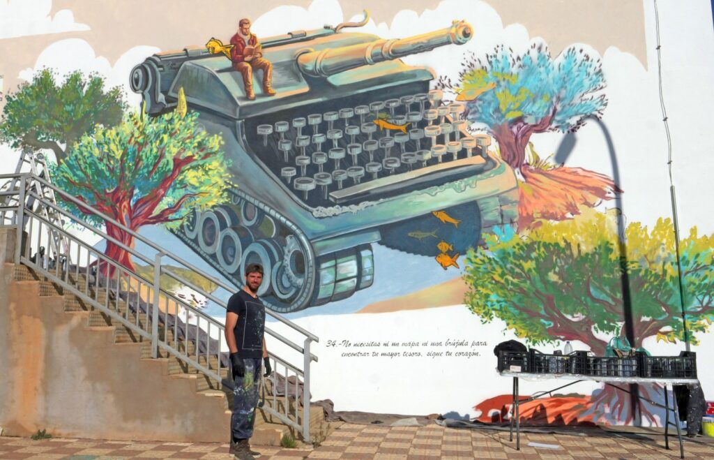 El mural también cuenta con olivos y representa a una persona segando el trigo que antiguamente había, a un zapatero o a un carpintero. En su caso, se ubica en la piscina municipal y se ha realizado durante siete días, como el de Consuegra.