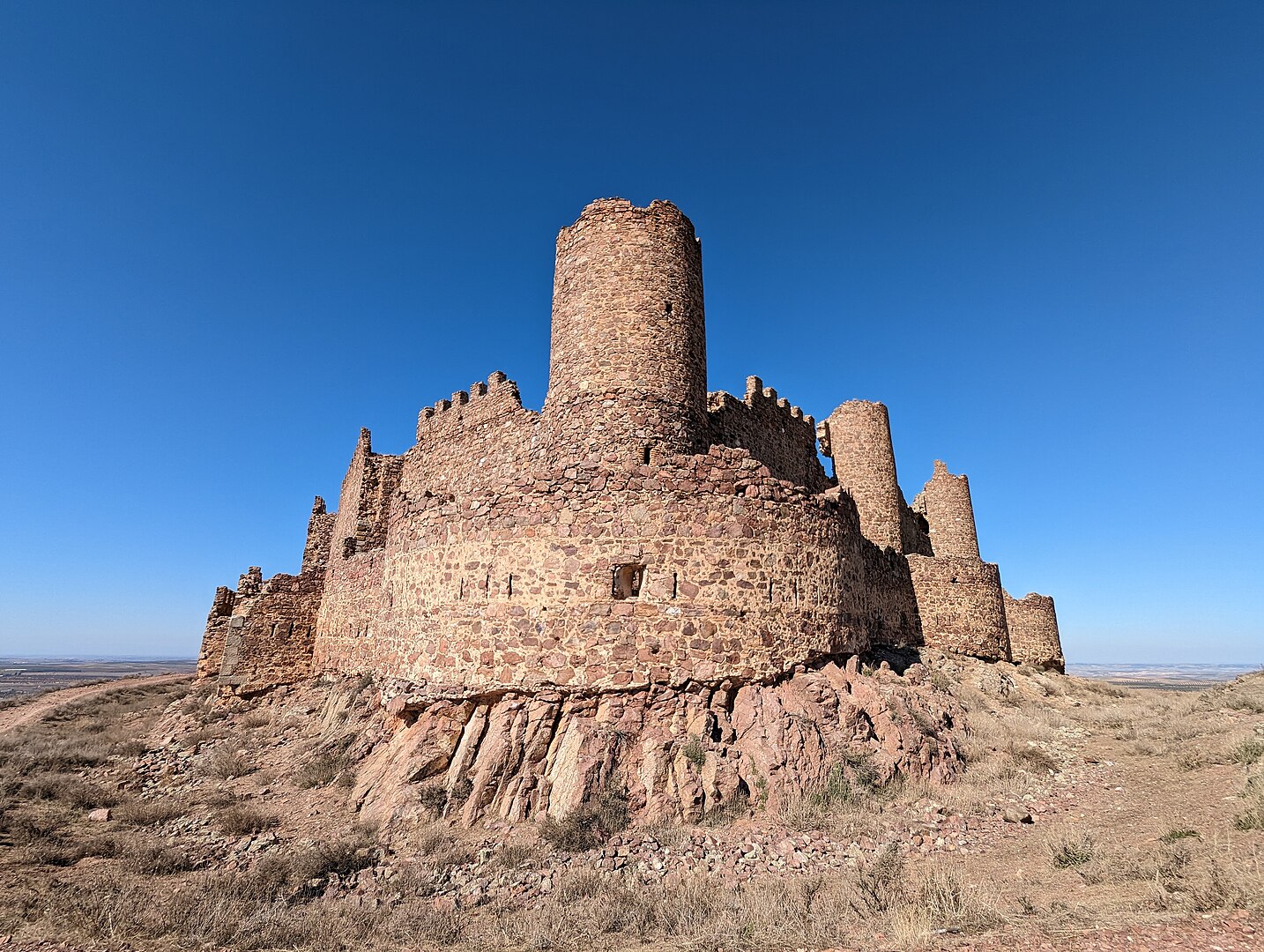Este castillo se sitúa en lo alto de un cerro, dentro del término municipal de Almonacid de Toledo, una localidad de unos 900 habitantes ubicada a 25 kilómetros de la capital castellanomanchega. De planta poligonal, tenía hasta ahora cinco torres, dos cuadradas y tres cilíndricas, todas semiderruidas.