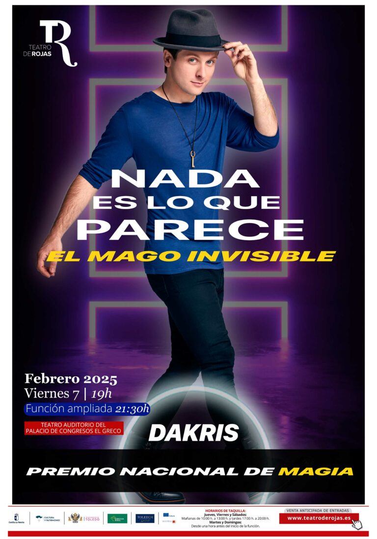 El espectáculo 'Nada es lo que parece' a cargo de Dakris 'El mago invisible' programado por el Teatro de Rojas en el Teatro Auditorio El Greco como inicio de la temporada de primavera para el próximo viernes 7 de febrero, a las 19.00 horas, llevará a cabo un nuevo pase, ese mismo día, a las 21.30 horas tras el gran éxito cosechado en la venta de localidades y la gran demanda que sigue existiendo.