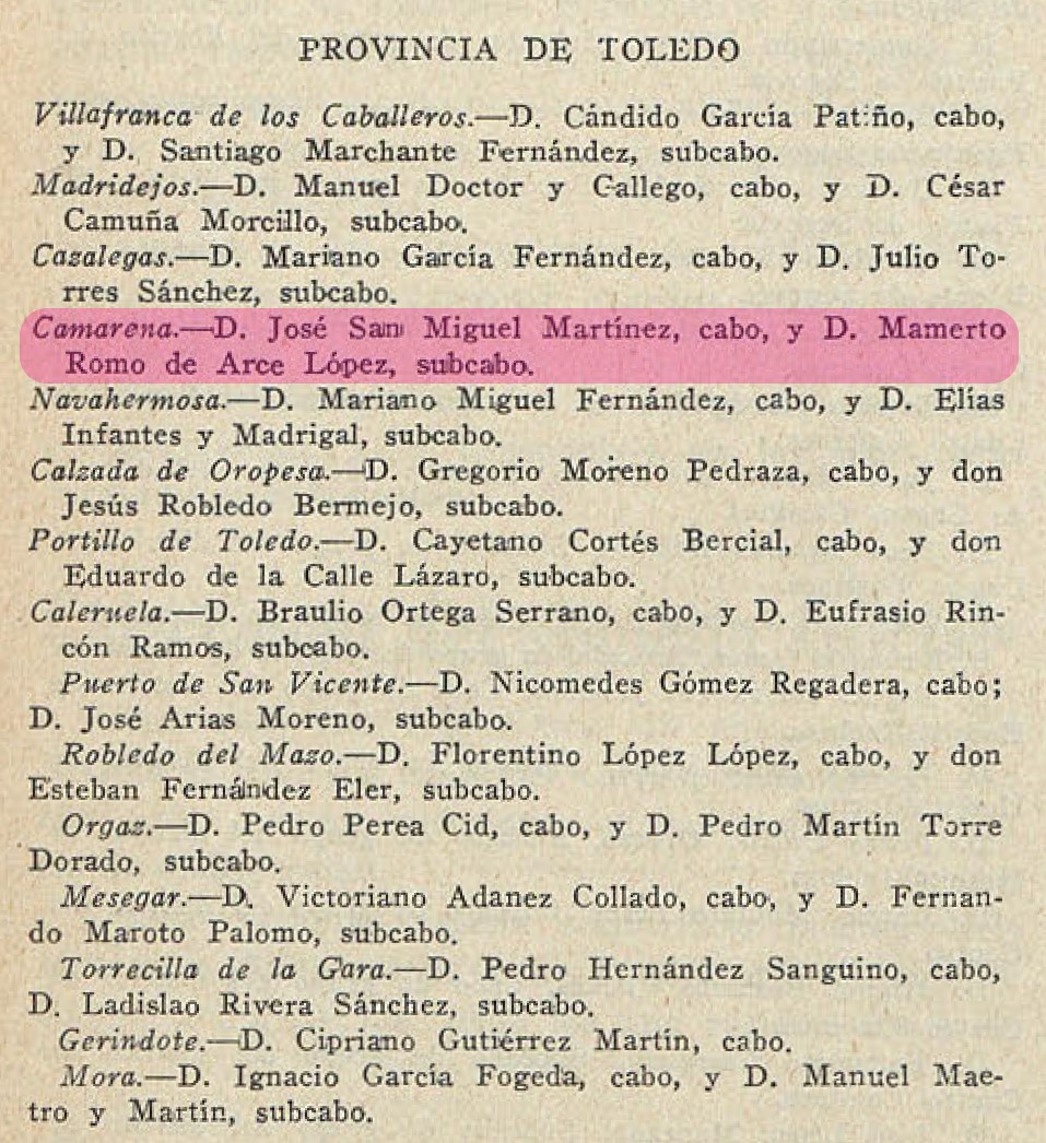 En Camarena, en 1925, el cabo del somatén era D. José San Miguel Martínez, médico de la localidad, y el subcabo D. Mamerto Romo de Arce López, tal y como aparece detallado en la relación nominal de los cabos y subcabos de distrito cuyo nombramiento fue aprobado y publicado en el nº 62 de la revista El Somatén de diciembre de 1925. Sabemos también que fueron miembros del somatén de Camarena D. Benjamín López Pérez, cuyo nombre aparece en el listado de “bajas por defunción” publicado en la misma revista en septiembre de 1928, y D. Virgilio López, de quién se conserva el recibo de pago de su suscripción trimestral a la citada revista El Somatén del 1 de diciembre de 1925 al 28 de febrero de 1926. Y que la madrina del somatén de Camarena fue Doña Esperanza San Miguel de Lozoya, hija del médico y cabo del somatén de Camarena D. José San Miguel Martínez, que participó en la imposición de medallas a las madrinas de las banderas del Somatén que se celebró el 13 de mayo de 1928 en el Paseo del Retiro de Madrid en una gran fiesta y acto de afirmación somatenista presidido por los reyes.