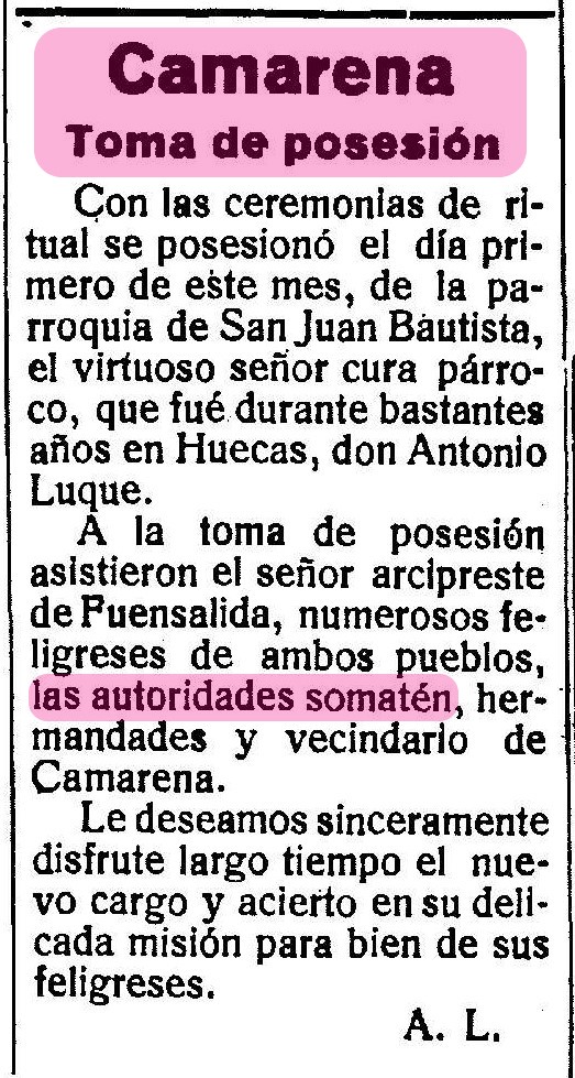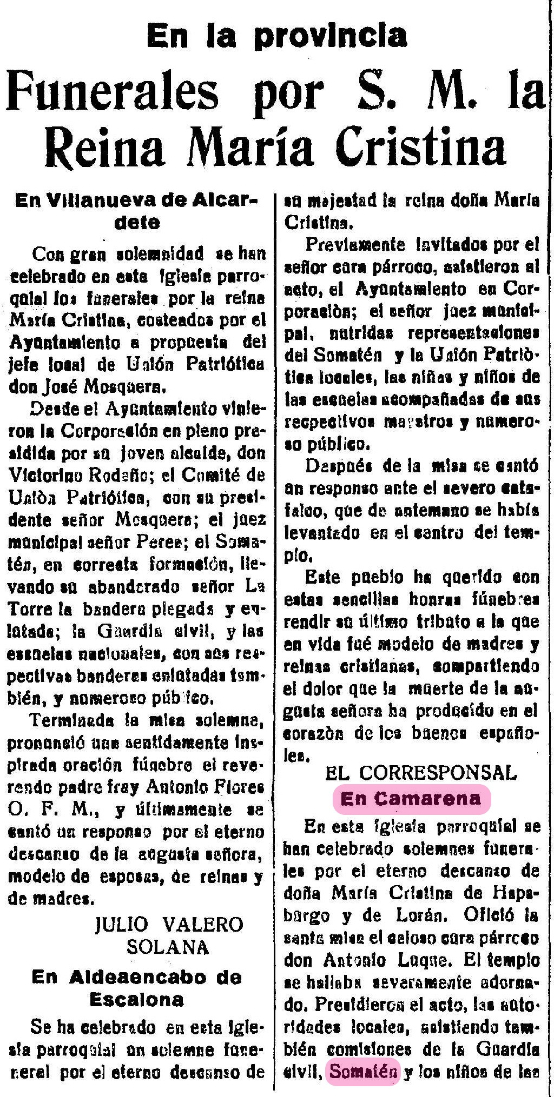 Entre 1923 y 1931 los somatenes se convirtieron en una institución y autoridad en toda regla en los municipios en los que se constituyeron, formando parte no solo de la vida cotidiana, del día a día, de los pueblos, si no también y especialmente de sus principales actos y eventos públicos, festivos o religiosos. La prensa del momento nos aporta varios ejemplos de las actividades y actos en los que intervino o participó el somatén de Camarena, como la toma de posesión de la iglesia de San Juan Bautista por el nuevo cura párroco de la localidad, D. Antonio Luque, en junio de 1926; el “servicio de vigilancia … con motivo del encierro de los toros que iban a lidiarse” en las fiestas de agosto de 1928; o su presencia en el funeral celebrado en marzo de 1929 en la iglesia de San Juan Bautista de Camarena “por el eterno descanso” de la reina María Cristina de Habsburgo-Lorena, madre del rey Alfonso XIII, fallecida el 6 de febrero de 1929.