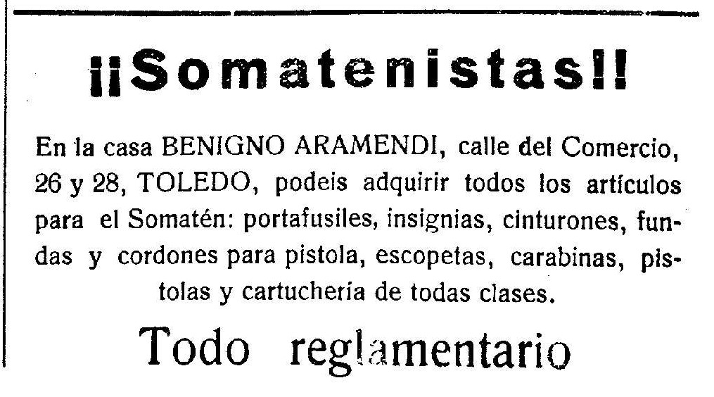 Los somatenistas tenían que tener un carnet del cuerpo de somatén, debían suscribir al boletín oficial del cuerpo y contaban con sus propias insignias y banderas. Asimismo, podían usar armas largas, teniendo su correspondiente licencia, y los cabos, subcabos y escoltas de bandera estaban autorizados también a llevar y al uso de armas cortas. Fue tal su importancia que llegaron a existir tiendas especificas donde podían “adquirir todos los artículos para el Somatén”, tal y como nos muestra este anuncio de “Casa Benigno Aramendi”, situada en la calle del Comercio de Toledo, publicado en el diario El Castellano en mayo de 1926.