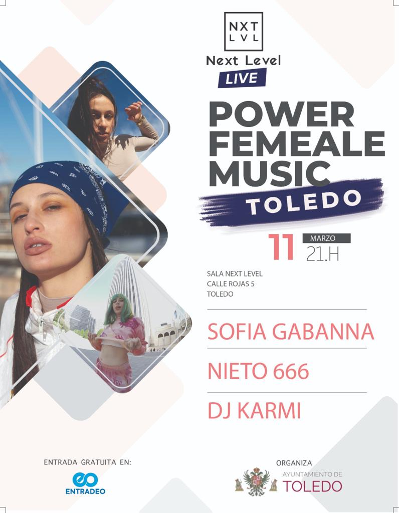 Organizador Festival FEM.22. Localización Next Level Next Level Toledo, Calle Rojas, Toledo Categoría Concierto Más Información Reserva de entradas Noticias Cultura Fecha viernes 11 Mar 2022 Finalizado! Hora 21:00 'Power female music' con: Sofia Gabanna, Nieto 666 y DJ Karmi Compartir este evento + Añadir Google Calendar Exportación + iCal / Outlook El evento está terminado.