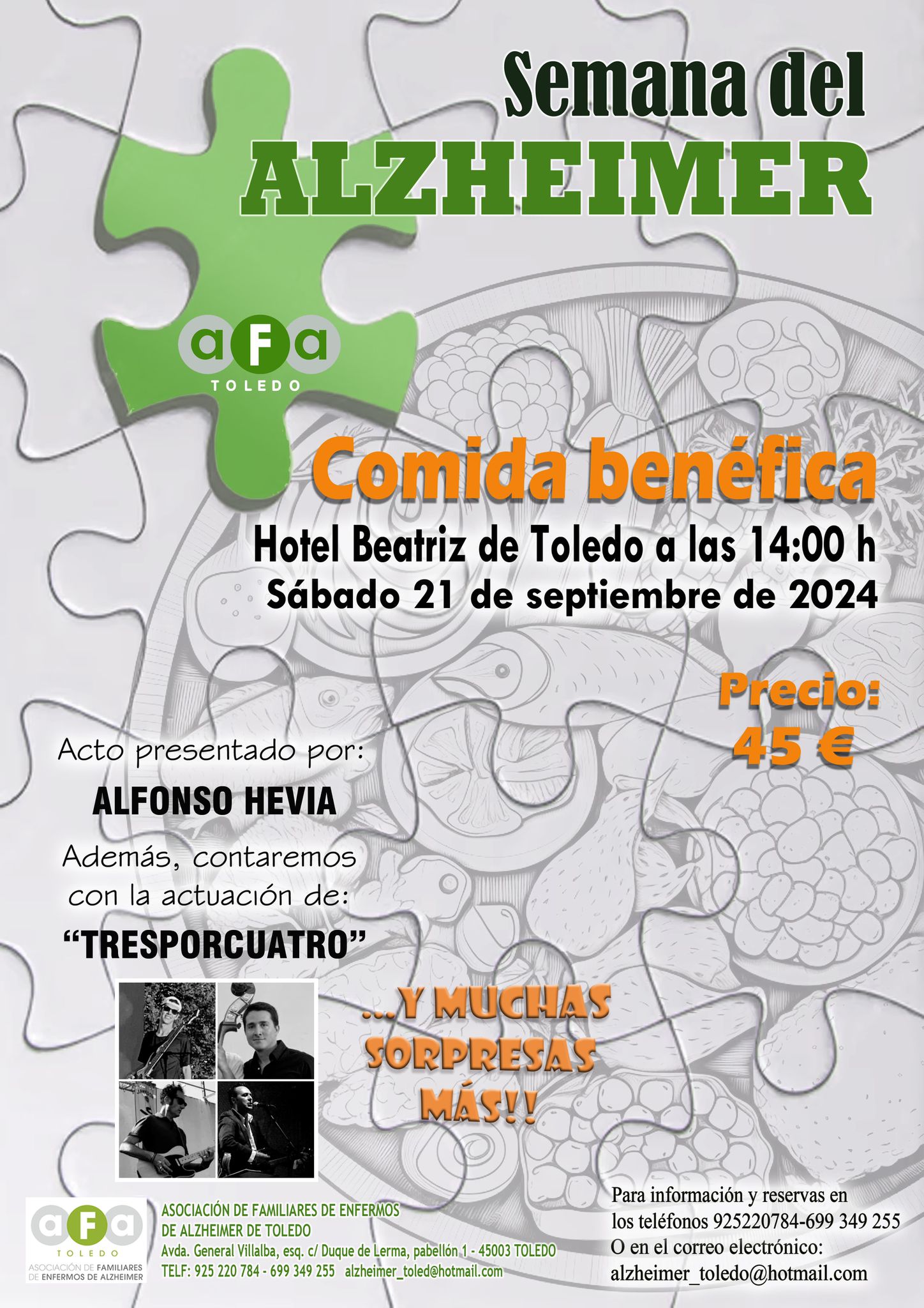 Organizador Asociación de Familiares de Enfermos de Alzheimer de Toledo Localización Hotel Beatriz Toledo Auditorium Categoría Comida benéficaConcierto Noticias Cultural Fecha sábado 21 Sep 2024 Finalizado! Hora 14:00 Coste €45.00 Comida benéfica de la Asociación de Familiares de Enfermos de Alzheimer de Toledo Compartir este evento + Añadir Google Calendar Exportación + iCal / Outlook El evento está terminado.