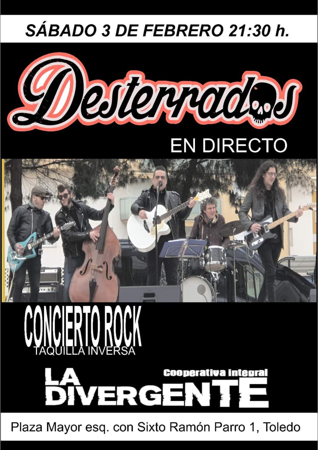 Imagen de archivo de un evento en La Divergente / Fotografía: cooperativa Organizador Cooperativa La DiverGente Correo electrónico https://ladivergente.com/ La Divergente Coopi es un centro cultural comunitario, una cooperativa de servicios culturales, un espacio de interacción social desde la cultura, la mediación y la construcción de procesos colectivos. Nuestra fuerza es nuestra gente. Somos cambio. Localización La DiverGente Calle Sixto Ramón Parro, Toledo Web https://ladivergente.com/ Categoría Concierto Noticias Cultura Fecha sábado 03 Feb 2024 Finalizado! Hora 21:30 Concierto de Desterrados en La Divergente Compartir este evento + Añadir Google Calendar Exportación + iCal / Outlook El evento está terminado.