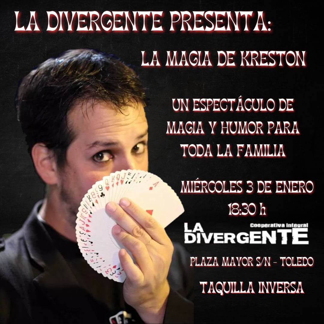 Localización La DiverGente Calle Sixto Ramón Parro, Toledo Web https://ladivergente.com/ Categoría Magia Noticias Cultura Fecha miércoles 03 Ene 2024 Finalizado! Hora 18:30 Coste Taquilla inversa Espectáculo 'La Magia de Kreston' Compartir este evento + Añadir Google Calendar Exportación + iCal / Outlook El evento está terminado.