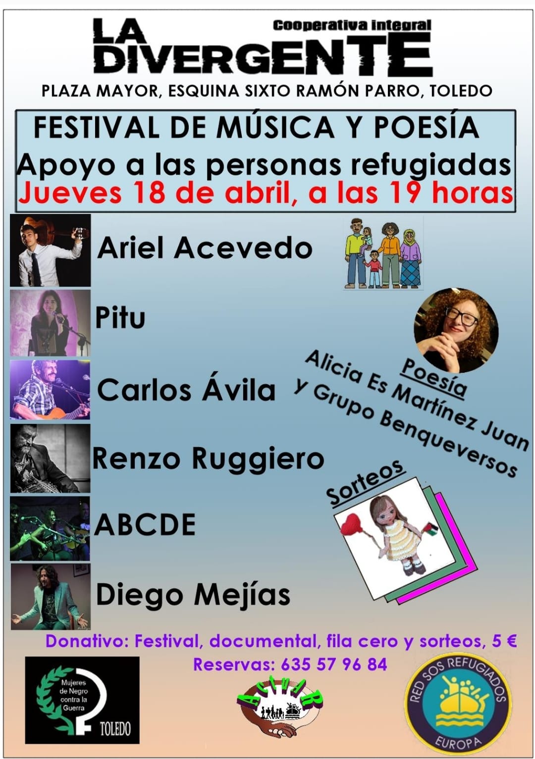 Actividad en La Divergente / Fotografía: cooperativa Localización La DiverGente Calle Sixto Ramón Parro, Toledo Web https://ladivergente.com/ Categoría MúsicaPoesía Noticias Cultura Fecha jueves 18 Abr 2024 Finalizado! Hora 19:00 Coste €5.00 Festival de música y poesía en apoyo a las personas refugiadas Compartir este evento + Añadir Google Calendar Exportación + iCal / Outlook El evento está terminado.