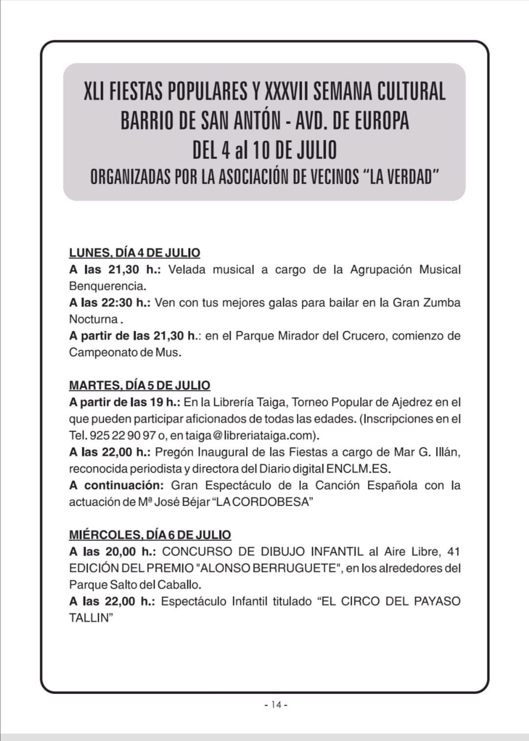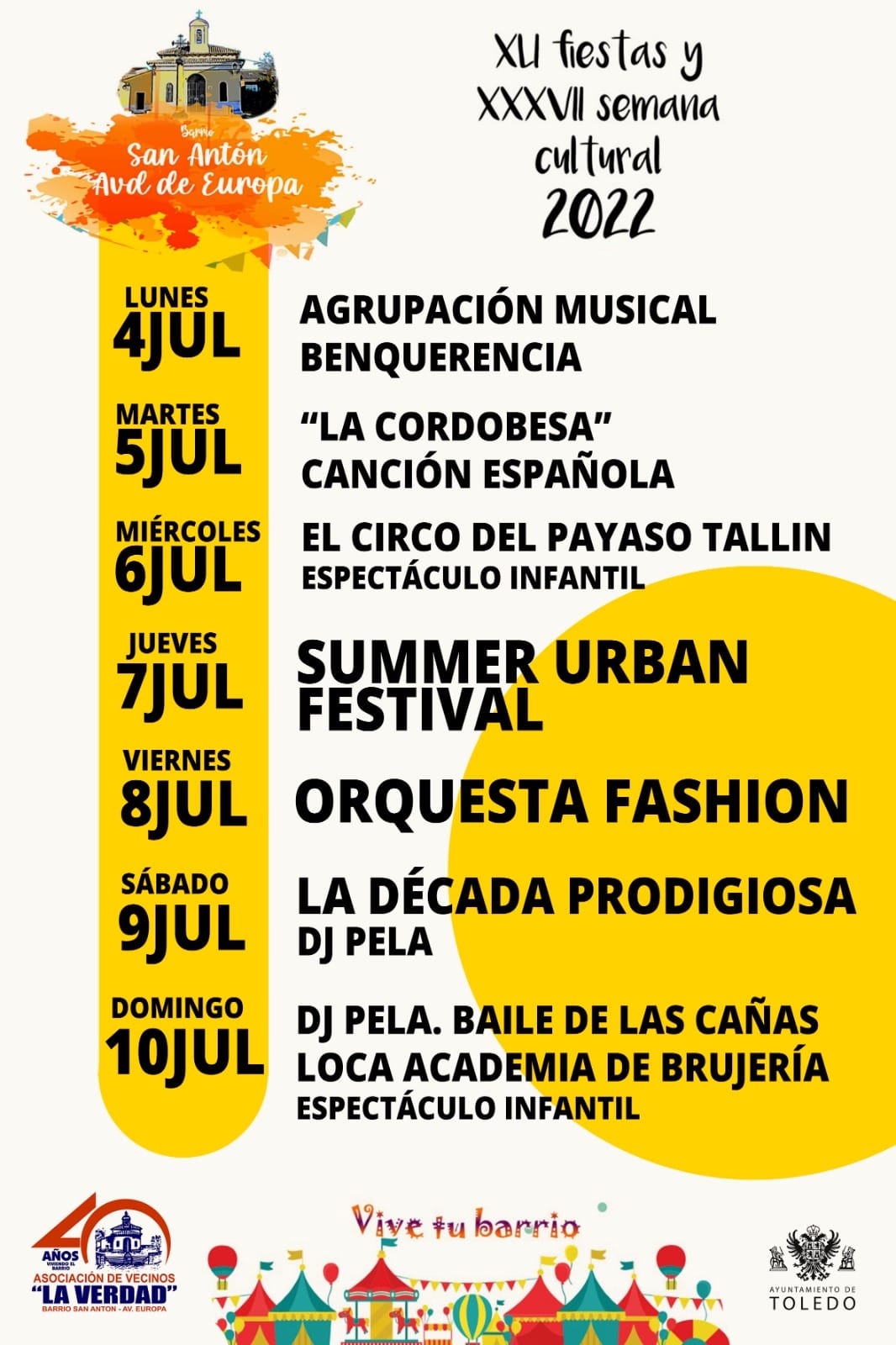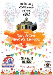 Localización Barrio de San Antón Categoría Fiestas Noticias Cultura Fecha lunes 04 - domingo 10 Jul 2022 Finalizado! Hora Evento de todo el día Fiestas del barrio de San Antón-Avd. de Europa Compartir este evento + Añadir Google Calendar Exportación + iCal / Outlook El evento está terminado.