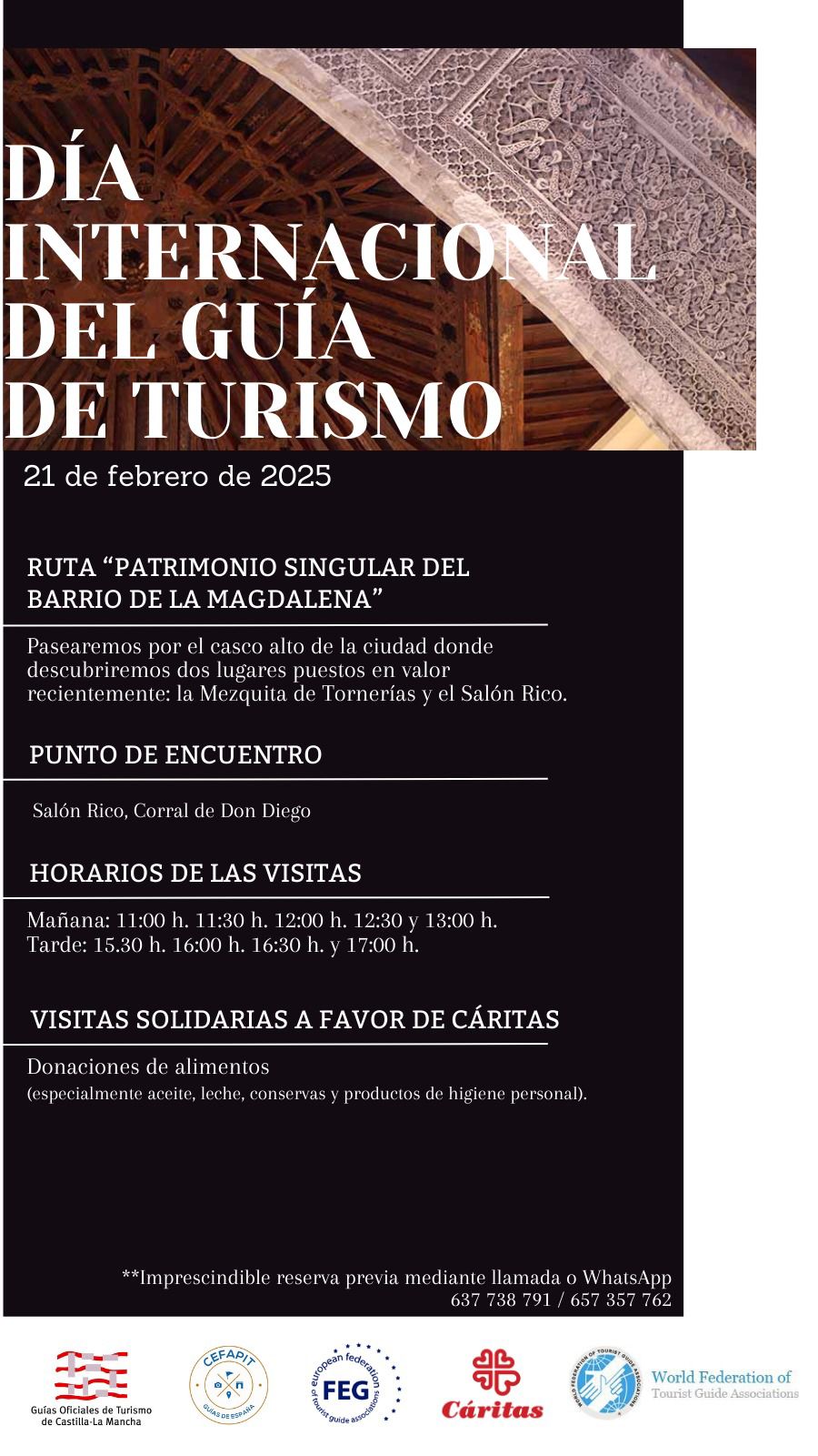 Para la conmemoración de esta fecha, los guías desarrollan diferentes actuaciones que pasan por visitas gratuitas, guiadas y solidarias, a espacios poco conocidos de la ciudad de Toledo o para visualizar la imagen de personajes históricos que han vivido o destacado en una determinada época.