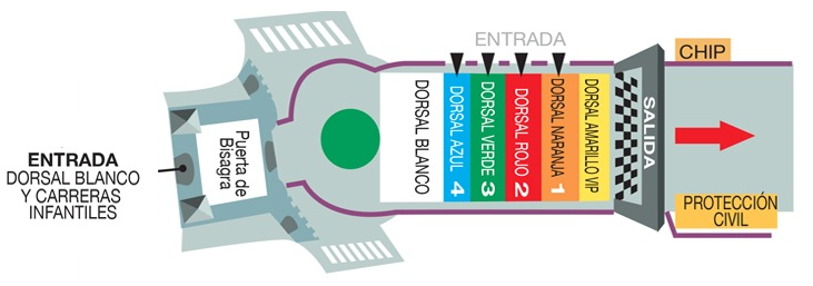 Se realizarán por la puerta de entrada correspondiente al color del dorsal.