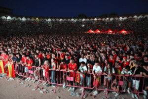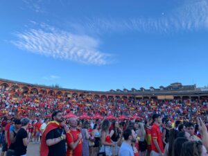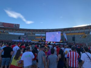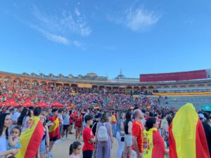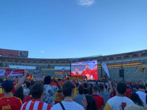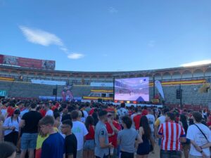 Cerca de 7.000 personas siguieron este domingo en la plaza de Toros de Toledo la victoria de la Selección Española de Fútbol masculina, que derrotó a la de Inglaterra por 2 a 1 tras un emocionante partido. Con este triunfo, la Roja se hace con su cuarta Eurocopa tras las conquistadas en 1964, 2008 y 2012.