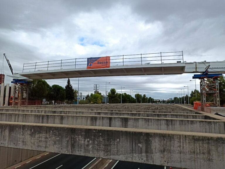 La estructura metálica de la pasarela fue fabricada por fases y se está montando en el sitio, "como un mecano". Recientemente se ha superado la fase de construcción más crítica: la instalación de toda la base de la pasarela se realizó la semana pasada sin interferir en el tráfico de la TO-23, gracias a la coordinación con la Guardia Civil y el Ministerio.