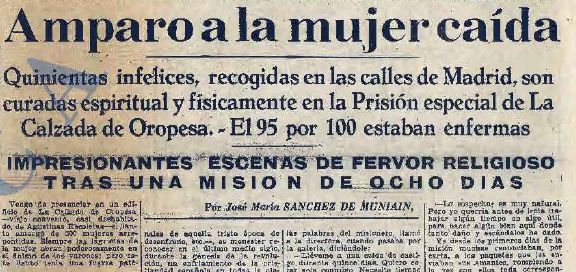 El 4 de diciembre de 1941, el semanario Redención, órgano del Patronato Central para la Redención de Penas por el Trabajo, publicó un extenso reportaje sobre las “extraviadas” de La Calzada de Oropesa. El autor del mismo era José María Sánchez de Muniaín, director de la publicación y miembro destacado de la Asociación Nacional Católica de Propagandistas. Ese sesgo religioso estaba muy presente en cada uno de los paternalistas párrafos de su texto, escrito tras la visita a la prisión de una misión sacerdotal a cargo del jesuita Martínez Colón.