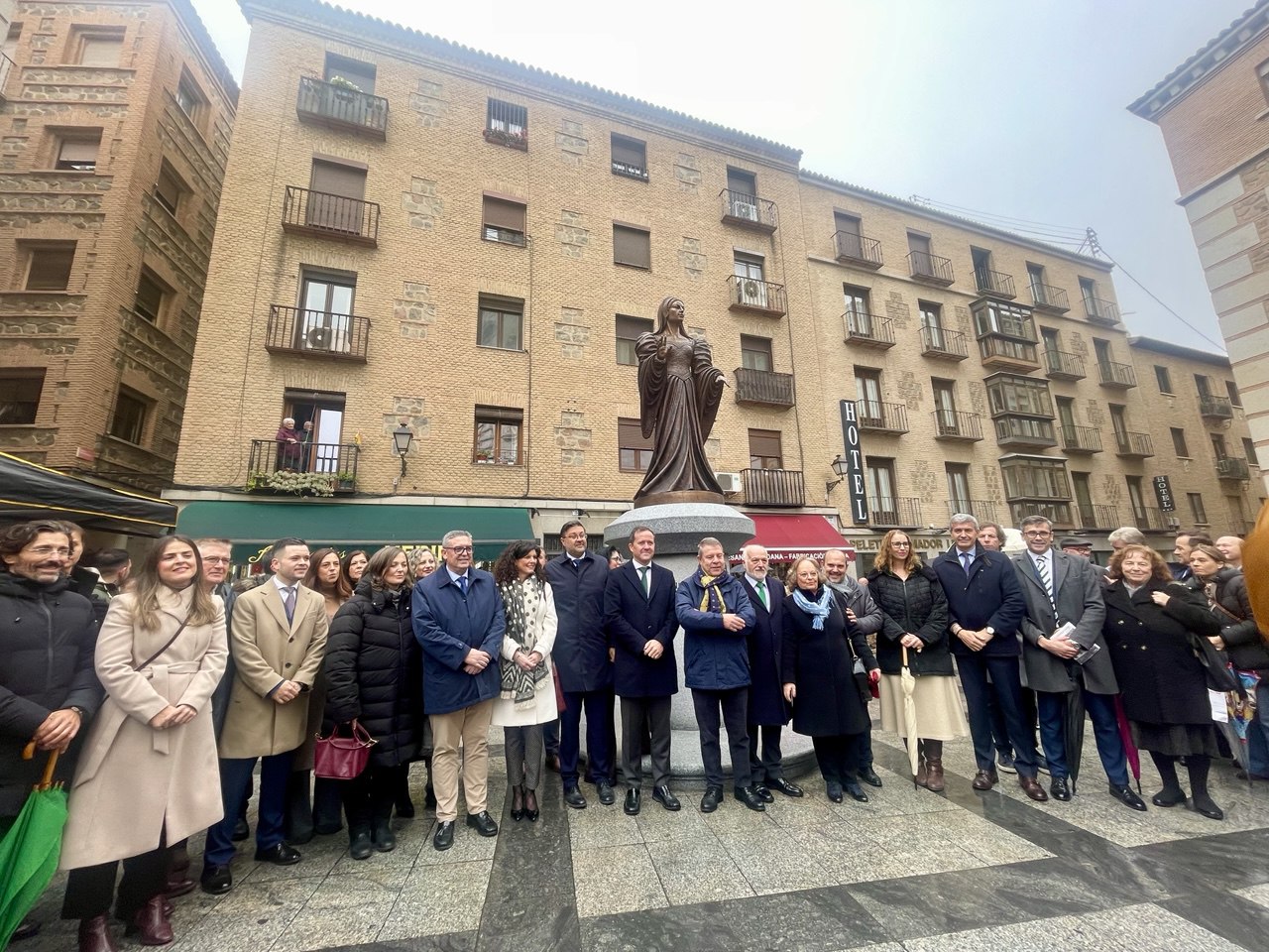 Junto a él, otros tres hombres han retirado el manto que cubría la escultura en el acto de inauguración: el presidente de Castilla-La Mancha, Emiliano García-Page; el consejero de Educación, Cultura y Deportes, Amador Pastor, y el alcalde de Toledo, Carlos Velázquez. En el acto han participado además políticos de todas las formaciones -incluido Vox- y representantes de diversas entidades sociales.