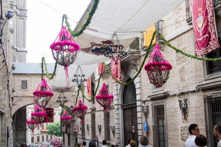 Guirnaldas, gladiolos, tomillo, anastasias o esparragueras. Toldos, faroles y estandartes. Tamboriles y dulzainas. Patios, patrimonio y música. Hay infinidad de términos con los que describir la forma en la que se celebra el Corpus en Toledo, la "fiesta grande" de la ciudad que este año 2023 se festejará entre el 29 de mayo -un día después de la cita electoral- y el 11 de junio.