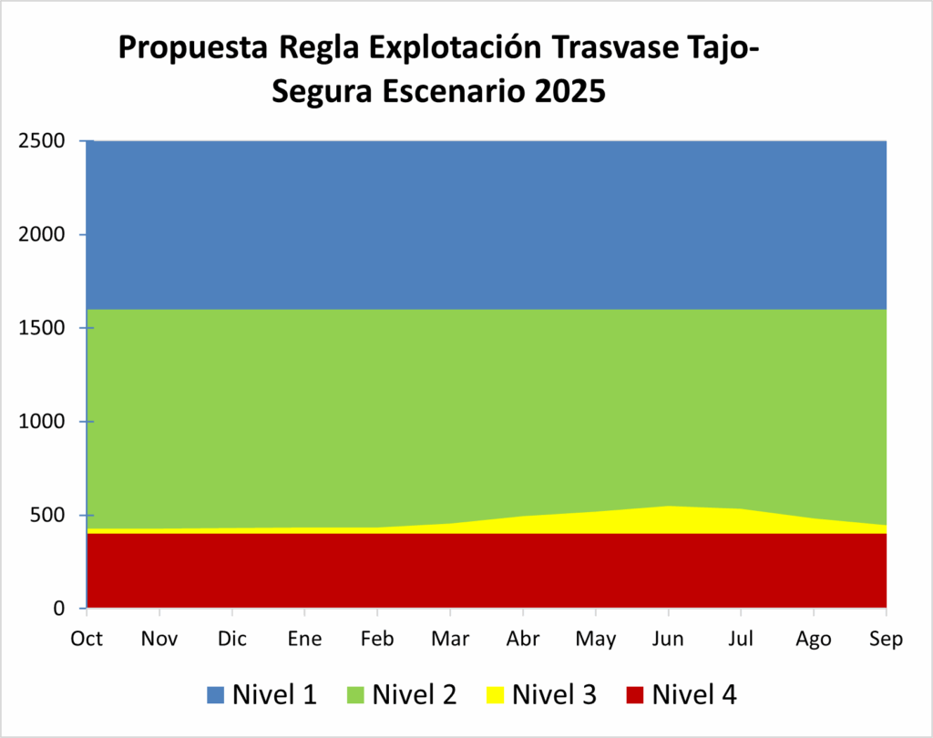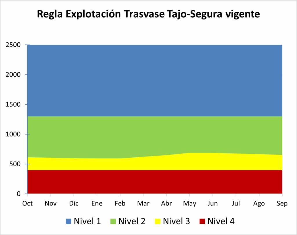 - 2. Limita la capacidad de almacenamiento de los embalses, por una subida insuficiente del límite del Nivel 1 (zona azul en la Figura). Si cuando los embalses se encuentren en niveles altos se permiten trasvases máximos, de gran cantidad de agua mensual, enseguida bajarán de nivel, desaprovechándose así, desde un punto de vista técnico, la capacidad de almacenamiento de agua en ciclos húmedos que permitan afrontar con garantías para el Tajo los ciclos secos. Es como si en vez de tener embalses enormes, los tuviéramos más pequeños. Con esta decisión se pierde una posibilidad de mejora de la gestión.