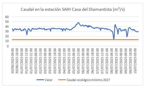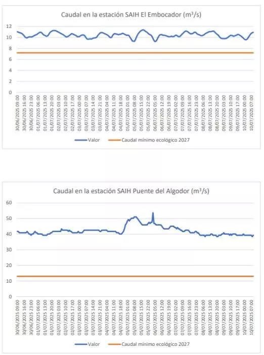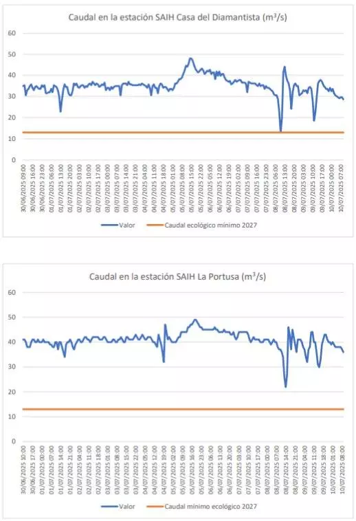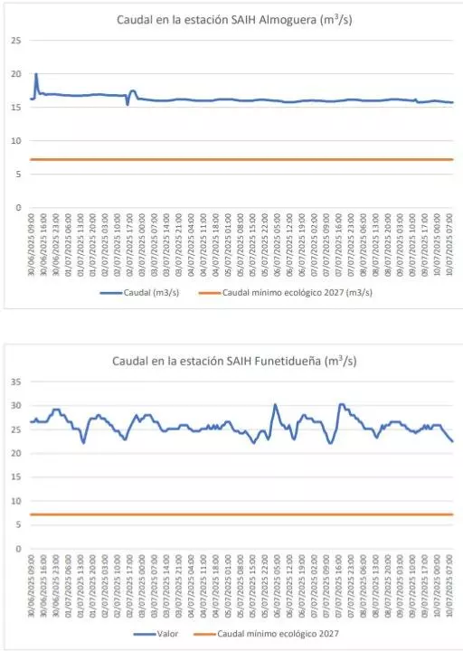Una vez conseguida una imagen general del tramo medio, se puede ver qué está sucediendo en cada una de las estaciones del SAIH. Del análisis de los datos horarios de los últimos diez días de cada una de las estaciones (véanse gráficas en anexo) se puede ver que los caudales mínimos ecológicos establecidos para 2027 se están cumpliendo en todo el eje del río Tajo. Es decir, la sentencia de 2025 del Tribunal Supremo (ganada por los colectivos ciudadanos) está siendo cumplida en estos primeros días del mes de julio que han sido analizados. Incluso la bajada de caudal en el día 8 de julio en Toledo estaría respetando el caudal mínimo ecológico de 2027 (13 m3/s en verano).No obstante, la alarma social que ha ocasionado la imagen en Toledo de estos 13 m3/s corrobora lo que ya se sabía, que los caudales mínimos ecológicos establecidos en el actual Plan Hidrológico no iban a suponer un cambio sustancial en la situación del río, como ya indicábamos en 2023.