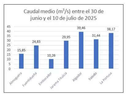 A continuación, la estación de Algodor muestra un notable incremento de caudales, sin duda causados por los aportes del río Jarama, que suponen en Aranjuez tres veces más cantidad que la que aporta el río Tajo. A continuación, la estación de Toledo vuelve a mostrar un descenso de un 20 %, unos 8 m3/s, muy posiblemente motivados por la presión agrícola en la zona. Por último, la estación de La Portusa, ubicada después de la confluencia del río Guadarrama, recoge los incrementos de caudal proporcionados por este último. Hay que señalar que actualmente no es posible conocer los caudales de la estación situada en Talavera de la Reina dado que la web institucional no aporta estos datos. Como conclusión, se puede señalar que el caudal del río Tajo en cabecera está fuertemente condicionado por las aguas reguladas para abastecer al trasvase Tajo-Segura, a lo que se le añade la fuerte presión que generan las captaciones agrícolas para riegos. Además, el río Jarama ha sido, también en estos diez días analizados, el principal aporte de caudal en el tramo medio.