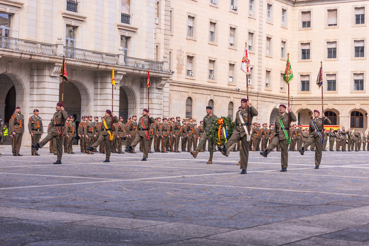 Este solemne acto se ha celebrado en el patio de la Academia de Infantería donde ha formado una compañía de honores del Regimiento Inmemorial del Rey, la banda y la unidad de música de la Dirección del Acuartelamiento y el contingente ucraniano que se está instruyendo actualmente en el 'Training Coordination Center' de Toledo.