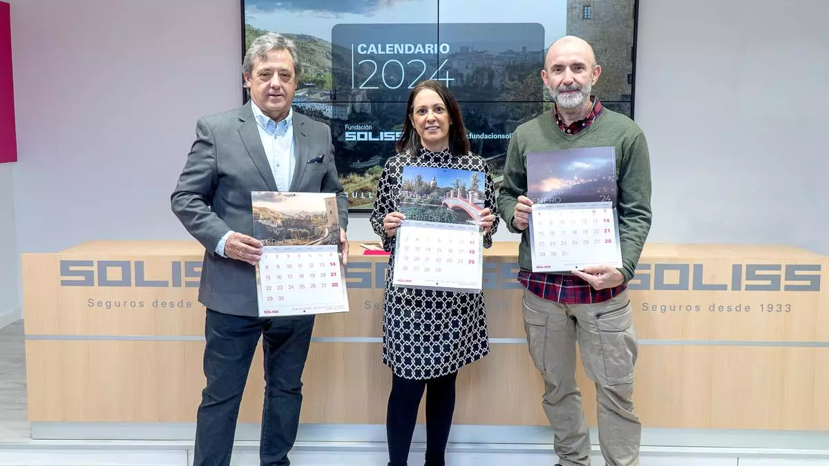 La sede central de Soliss ha acogido el acto protocolario de renovación del acuerdo de colaboración entre Fundación Soliss y Futucam y se ha presentado el nuevo calendario solidario 2024 de Soliss. Al acto han acudido la gerente de Futucam, Carmen de la Llave; el director de Fundación Soliss, César Duro; y Javier Vivar, que ha sido el fotógrafo encargado de realizar las 12 fotos finalistas.