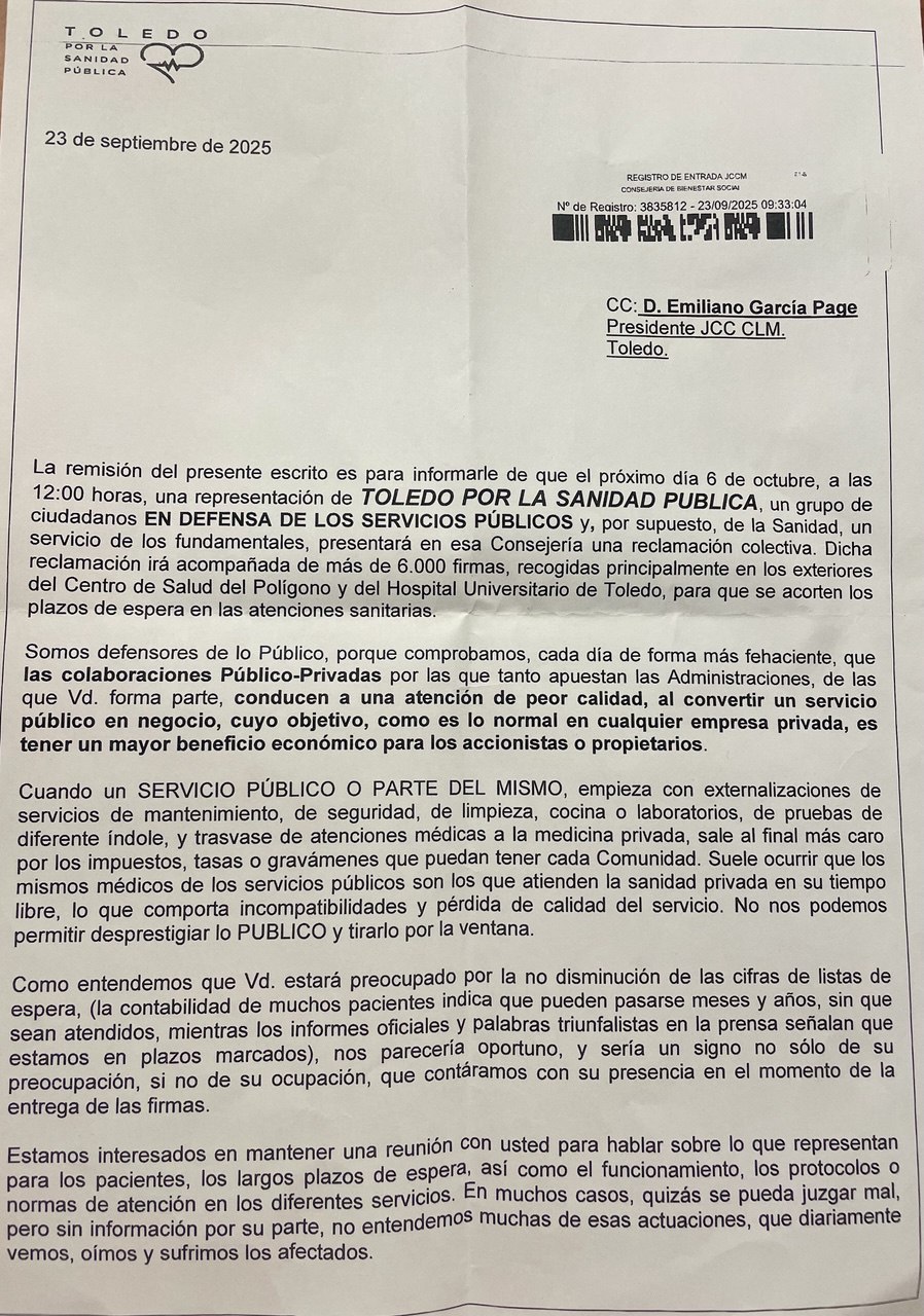 La plataforma 'Toledo por la Sanidad Pública' ha presentado este lunes ante la Consejería 6.421 firmas que han recogido en los últimos meses en las inmediaciones del centro de salud del Polígono y el Hospital Universitario de Toledo para reclamar una solución a las "largas" listas de espera en la región.