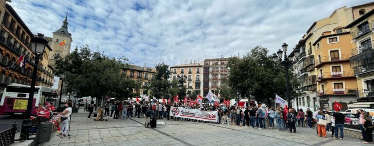La plantilla de Caixabank en España y en Castilla-La Mancha ha vuelto a escenificar hoy su "radical rechazo" al ERE que pretende ejecutar la dirección de la entidad. La huelga a jornada completa convocada por todos los sindicatos representativos está teniendo un seguimiento superior al 90% en las 352 oficinas de Caixabank ubicadas en la región, todas ellas cerradas al público. Alrededor de la mitad de los 1.100 trabajadoras y trabajadores con los que cuenta la entidad han acudido a Toledo a expresar en la plaza de Zocodover su oposición al ERE; y quienes no han podido hacerlo se han manifestado con sus compañeros y compañeras a las puertas de sus oficinas. En Albacete, más de medio centenar se concentró de forma espontánea ante la sucursal de Caixabank en la plaza del Altozano.