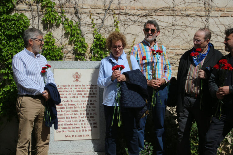 César y 'Mayu', Gloria, son dos de los familiares que acudieron a un emotivo y sencillo acto de homenaje a las personas víctimas de campos de concentración nazi, en una jornada en la que se celebran los 80 años de liberación del campo de concentración de Mauthausen. La plaza del Sofer acogió el acto, donde reside desde 2014 un monolito en recuerdo a los toledanos deportados y fallecidos en campos de concentración.